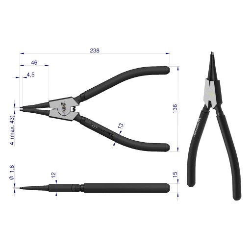 Szczypce Segera 240mm proste zewnętrzne do pierścieni osadczych Waryński, informacje techniczne: