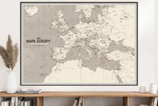 Skandynawska mapa Europy projektowana była pod wnętrza z chłodnymi beżami i brązami, być może z turkusowymi dodatkami.