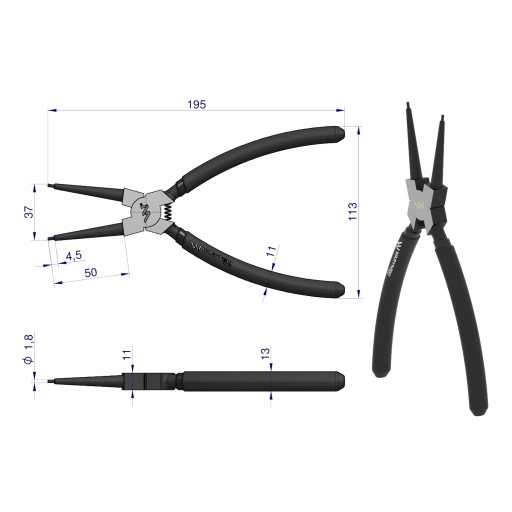 Szczypce Segera 200mm proste wewnętrzne do pierścieni osadczych Waryński, informacje techniczne: