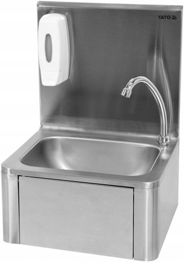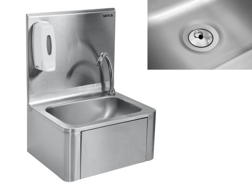 Umywalka kolanowa YATO wykonana jest z wysokiej jakości stali nierdzewnej. W zestawie jest także wylewka sztorcowa, dozownik na mydło oraz komplet zaworów i wężyków koniecznych do zainstalowania umywalki i podłączenia jej do sieci wodociągowej. Poza zaworem czasowym uruchamianym kolanem, w zestawie jest także mikser z regulacją, który umożliwia ustawienie temperatury wody.