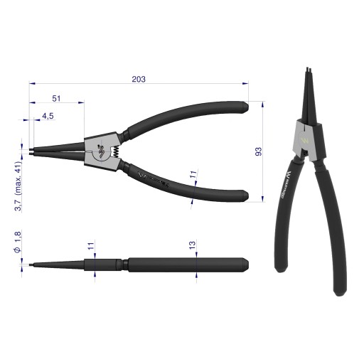 Szczypce Segera 200mm proste zewnętrzne do pierścieni osadczych Waryński, informacje techniczne: