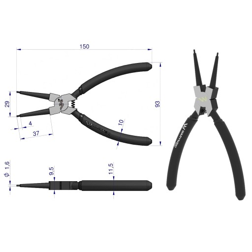 Szczypce Segera 150mm proste wewnętrzne do pierścieni osadczych Waryński, informacje techniczne: