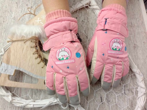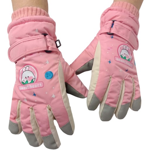 Piękne, ciepłe, pięciopalczaste rękawiczki dziecięce z motywem królika. Od wewnątrz wypełnione milutkim misiem. Od spodu rękawiczek warstwa gumowa ułatwiająca chwytanie. Posiadają ściągacz zabezpieczający oraz zapięcie na rzep. Rękawiczki można spiąć razem.