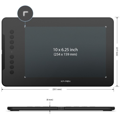 XP-Pen Deco 01 V2 został wyposażony w obszar roboczy 25,4 x 15,9 cm co zapewnia więcej miejsca na tworzenie kreatywnych prac. Jego grubość to jedynie 0,8 cm, dzięki czemu idealnie nadaje się do zabrania w podróż, nie wpływając znacząco na Twój komfort. Tablet podświetla się na końcach obszaru rysowania i ma regulowane poziomy jasności, dzięki czemu możesz pracować i tworzyć nawet w słabo oświetlonym pomieszczeniu.