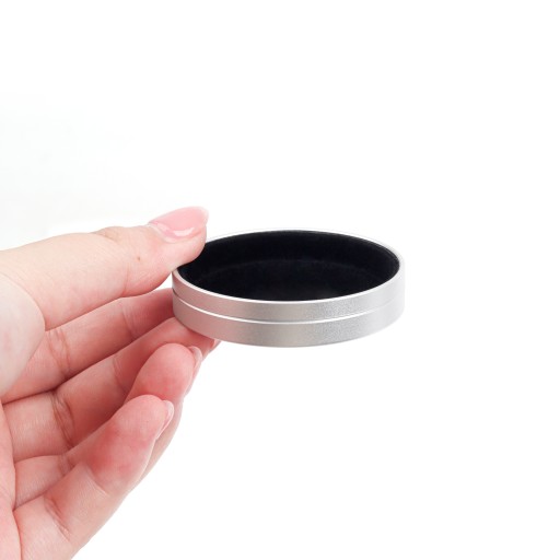 Dekielek wykonano z aluminium. Wewnątrz wyłożono czarnym, miękkim materiałem welurowym.