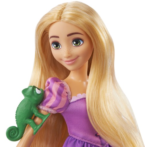 - Roszpunka ma długie włosy i szczotkę w kształcie patelni do zabawy w czesanie i stylizację fryzur.