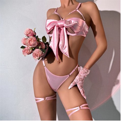 Odkryj swoje kobiece wdzięki i poczuj się atrakcyjnie dzięki kompletowi bielizny erotycznej. Damski komplet ekscytującej bielizny to skuteczny sposób na podkreślenie swojej kobiecości, seksualności i wdzięku. Kokardka na piersi dodaje kompletowi bielizny erotycznej szczególnego uroku. Gładki, satynowy materiał erotycznego kompletu wygląda stylowo i zapewnia wygodę. Stanik, stringi i podwiązki posiadają regulację obszerności, dzięki czemu możesz dopasować je do swoich parametrów. Intymna, piękna, seksowna bielizna erotyczna dostępna jest w dwóch wersjach kolorystycznych. Zestaw seksownej bielizny, które dodadzą Twojemu wyglądowi kompletności, odwagi, pewności siebie i fantazji do intymnych zabaw.