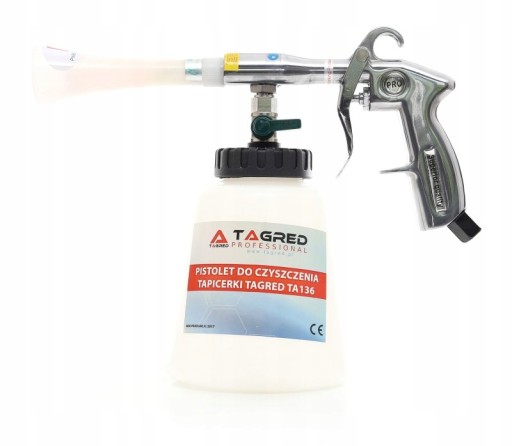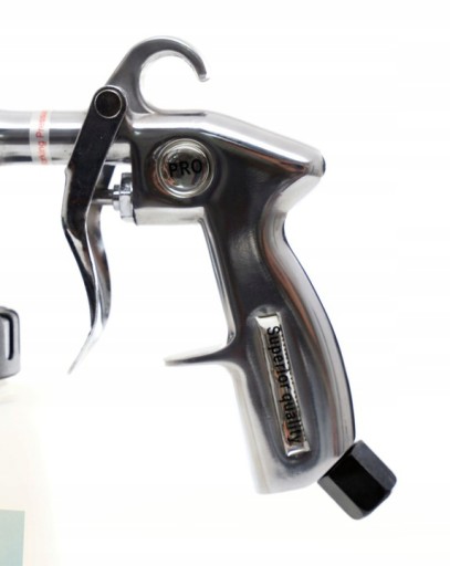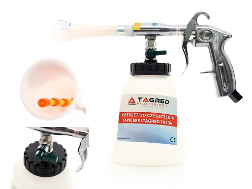 Wysokiej jakości, przeznaczony zarówno dla amatorów jak i profesjonalistów pistolet do czyszczenia na mokro zabrudzeń karoserii i wnętrza samochodu m.in. wylotów powietrza, klimatyzacji, elementów lustrzanych i z tworzywa, siedzeń, tapicerki, dywaników, trudnego do usunięcia brudu i zanieczyszczeń. Pistolet dzięki specjalnie ukształtowanej dyszy z wirującym rdzeniem, wytwarza pod wpływem sprężonego powietrza, spieniony roztwór czyszczący, który czyści wszystkie elementy, zwilżając je w niewielkim stopniu! To bardzo wydajne urządzenie, zużywa minimalne ilości wody i środków czyszczących. Dociera do wszelkich trudno dostępnych miejsc, szczelin, tam gdzie nie dotrze zwykła gąbka, szmatka, szczotka czy pędzelek !!! Idealnie nadaje się do komercyjnego czyszczenia różnego rodzaju powierzchni jak tapicerki, meble, felgi, wyloty powietrza itp. Do pracy nie potrzebuje dużych kompresorów, wystarczy ciśnienie to 5bar. Pistolet posiada regulację dozowania środka chemicznego która pozwala na dostosowanie roztworu do czyszczonej powierzchni.