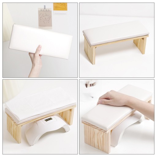 Pod drewnianym stojakiem podpórki na dłonie jest wystarczająco dużo miejsca, które można wykorzystać do umieszczenia narzędzia do fototerapii paznokci.