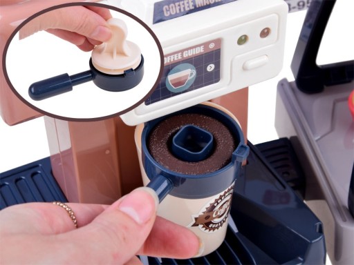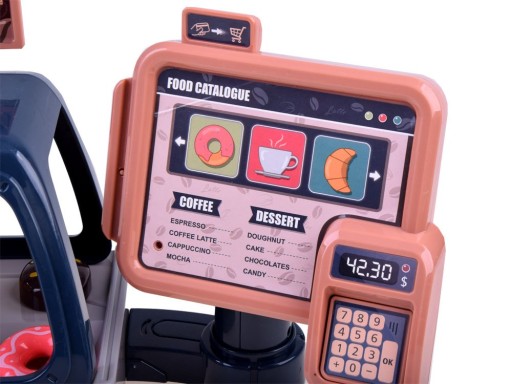 Kawiarnia z ekspresem z witryną i kasą, na pewno spodoba się każdemu małemu bariście. Cały zestaw składa się z 41 elementów i zawiera wszystko, co jest niezbędne w każdej kawiarni. Wszystkie elementy zabawki (kasa, ekspres, witryna) można ze sobą dowolnie łączyć lub używać oddzielnie. Zabawka posiada efekty świetlne i dźwiękowe.