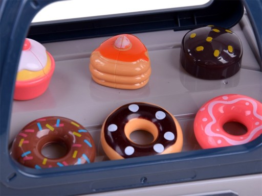 Kasa posiada obrotowy panel, po naciśnięciu pinpadu usłyszymy dźwięk jej otwierania, a po przesunięciu kartą płatniczą usłyszymy piknięcie. W witrynie możemy wyeksponować wszystkie słodkości, które mamy w ofercie. Takie słodycze na pewno będą smakować każdej lali lub misiowi łasuchowi. Dołączone akcesoria sprawią, że zabawa nie będzie nudna. Znajdziemy tu min. ciasteczka, kubeczki do przyrządzenia kawy na wynos, kartę kredytową i pieniądze: monety i banknoty.