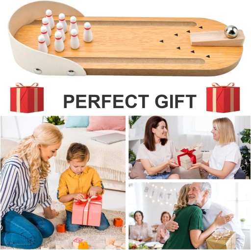 [Premium Material]Wooden mini bowling game is made of high quality natural, environmental and healthy wood; safe, sturdy, lightweight and durable.Package Included: The mini bowling set contains a launching chute, wooden bowling lane with gutters, 1 metal bowling ball, 10 bowling pins.Creative design,premium material and personalized packaging, small size portable pocket board game, travel must haves.