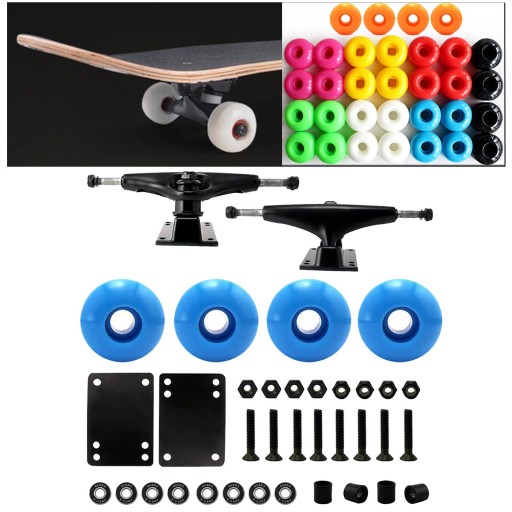Zestaw części do deskorolki: Zawiera trucki do deskorolki 5.0, kółka do deskorolki, łożyska do deskorolki Abec 9, śruby do deskorolki 1 cal, podkładki pod deskorolkę 2mm, podkładka pod deskorolkę.