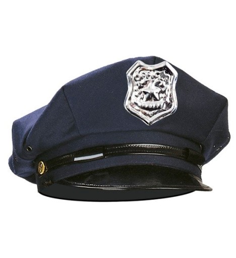 Granatowa czapka policyjna dla policjanta/policjantki. Posiada usztywniony daszek w kolorze czarnym. Z przodu czapki jest srebrna naszywka z napisem Officer (na zdjęciu jest przedstawiona naszywka o innym napisie, ale o tym samym kolorze i kształcie ). Kapelusz może stanowić samodzielny gadżet bądź uzupełnienie stroju.