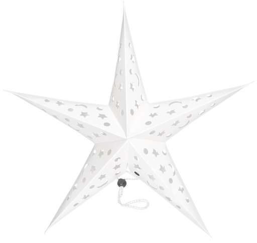 Ozdoby świąteczne to nie tylko choinka ustrojona bombkami i lampkami. Jedną z takich wyjątkowych, świątecznych dekoracji jest ta piękna, papierowa gwiazda. Wykonana jest z sztywnej tektury, dzięki czemu z łatwością zachowuje swój kształt. Możemy ją podwiesić do żyrandola lub sufitu. Świetnie prezentuje się zawieszona w oknie na karniszu – widać ją wtedy zarówno wewnątrz mieszkania jak i z zewnątrz. Na powierzchni znajdziemy ażurowy wzór w małe gwiazdki. Do zawieszenia służy biały sznurek.