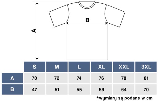 W tym celu rozłóż na płaskiej powierzchni swoją ulubioną koszulkę, a następnie zmierz odległości od najwyższego punktu do najniższego (A) oraz pomiędzy pachami (B). Porównaj wymiary z tabelą i dobierz właściwy dla siebie rozmiar.