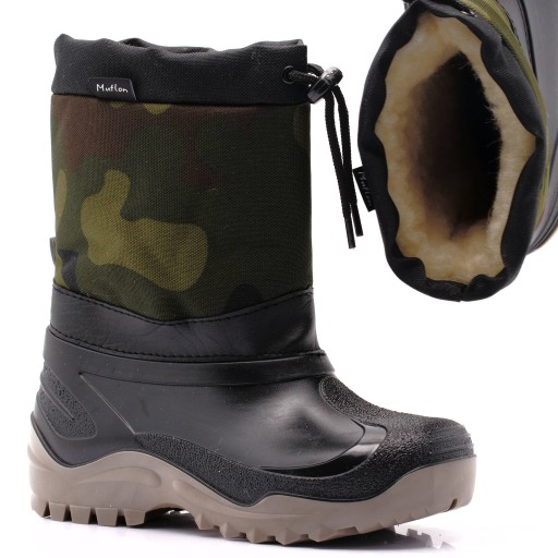 Bardzo ciepłe śniegowce dla dzieci, polskiej firmy MUFLON. Wykonane są z wysokiej jakości materiałów. Górna część cholewki zrobiona jest z ortalionu (zaimpregnowany materiał tekstylny), odporny na przemoczenie ze ściąganym kołnierzem zabezpieczającym przed dostawaniem się wody i śniegu do środka. Buty są ocieplone od wewnątrz naturalną 100 % wełną. Posiadają ocieploną wkładką z folii aluminiowej perforowanej, otoczonej od góry i dołu włókniną, dzięki czemu zachowuje doskonałe właściwości termoizolacyjne.