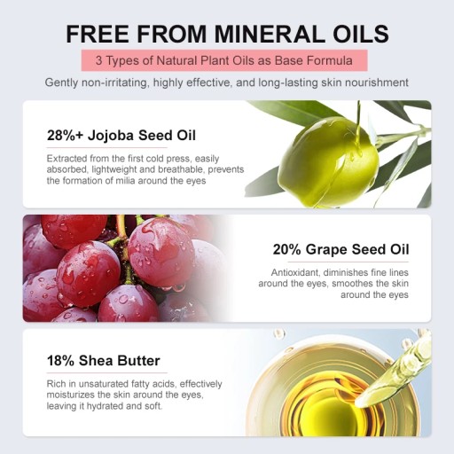 Przy użyciu mieszanki czterech naturalnych olejków roślinnych jako bazy-olej Jojoba, olej z pestek winogron, oleju masło Shea i skwalanu, jest delikatny, niedrażniący i nie pobudzający oczu. Ponadto jest niezwykle przyjazny dla skóry i miękki, bez wysiłku wtapiając się w skórę, odżywiając okolice oczu bez tłustości i bez powodowania milii.
