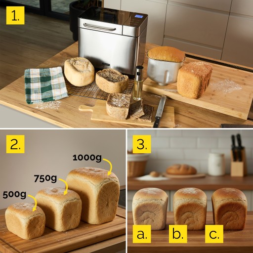 2️⃣ 3 wielkości bochenka - 500g, 750 g lub 1000 g - upiecz chleb dla 2-5 osób i codziennie ciesz się świeżym bochenkiem bez marnowania.