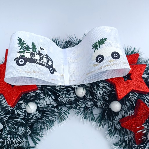- EFEKTOWNA, ŚWIĄTECZNA KOKARDA Z MOTYWEM SAMOCHODÓW WIOZĄCYCH CHOINKI