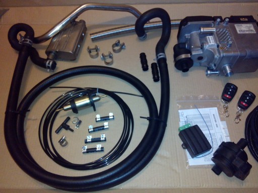 Kompletne ogrzewanie postojowe Webasto Thermo Top ZCD, 5 kW diesel, pilotem (2 sztuki) o zasięgu ok 70m. Jest to ogrzewanie uniwersalne, będzie działało w każdym aucie (domku, łodzi itp.) z instalacją 12V.