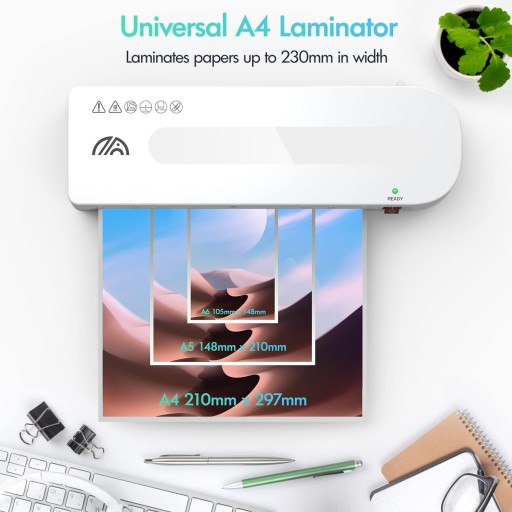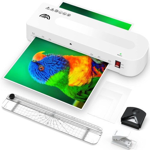 - W zestawie 1 laminator A4, 15 arkuszy laminatora termicznego (5 A4/A5/A6), 1 gilotyna do papieru, 1 zaokrąglarka rogów i 1 dziurkacz, aby sprostać codziennym potrzebom.