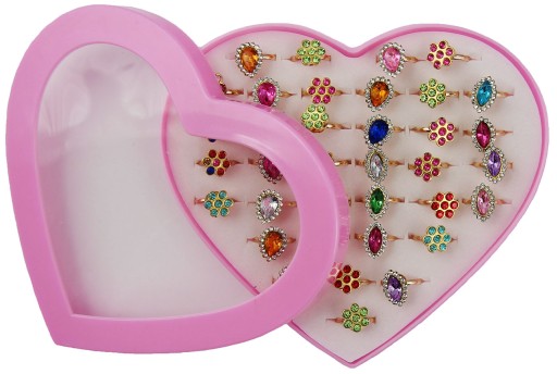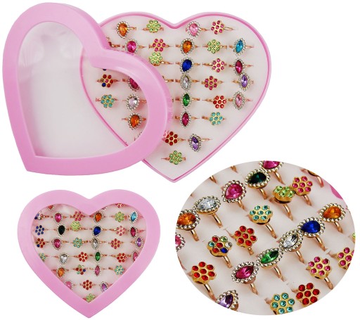 Zestaw 36 pierścionków dla dziewczynki. Każde opakowanie zawiera 36 pierścionków. Pierścionki pięknie się błyszczą wykonane z metalu. Rozmiar uniwersalny, średnica oczka 11 milimetrów z lekką regulacją.