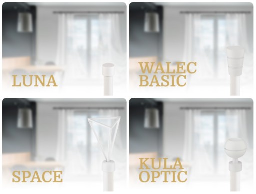 Seria karniszy w bieli składa się z drążek o przekroju 19 milimetrów, wsporników ściennych oraz kilku zakończeń dekoracyjnych. Wśród nich zakończenie Luna – minimalistyczne zakończenie w kształcie zaślepki. Zaletą takiego rozwiązania jest pewność, że karnisz nigdy nie wyjdzie z mody i będzie spełniał swoje zadanie nawet gdy postanowimy zmienić wystrój. Inna propozycja to Walec z dwoma małymi frezami. Dla tych, którym bliższe są klasyczne rozwiązania, oferujemy zakończenie Kula Optic. Największym zainteresowaniem wśród naszych Klientów cieszy się zakończenie w kształcie geometrycznej figury przestrzennej - Space.