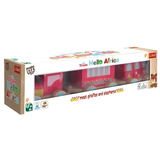 Produkt składa się z 3 wagoników, które można od siebie odłączyć, a także 2 figurek zwierząt. Train Africa wzmacnia odruch chwytania i rozwija koordynację wzrokowo-ruchową u dziecka. Uczy też kształtów, kolorów oraz nazw zwierząt. Wszystkie materiały, z których została wykonana zabawka, posiadają atesty oraz zostały pomalowane nietoksycznymi farbami.