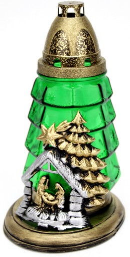 ZNICZ SZKLANY - model świąteczny CHOINKA zielone szkło z ozdobną aplikacją Bożonarodzeniowej szopki z Św. Rodziną + wkład 30h palenia