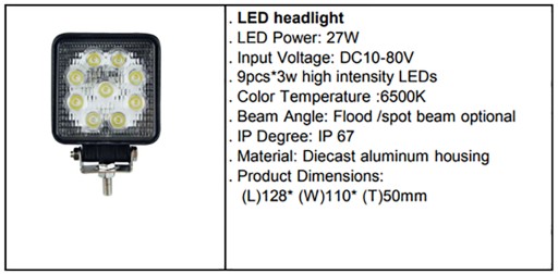 ГАЛОГЕННАЯ ПЕРЕДНЯЯ РАБОЧАЯ ФАРА ДЛЯ ВИЛОЧНОГО ПОГРУЗЧИКА LED 9