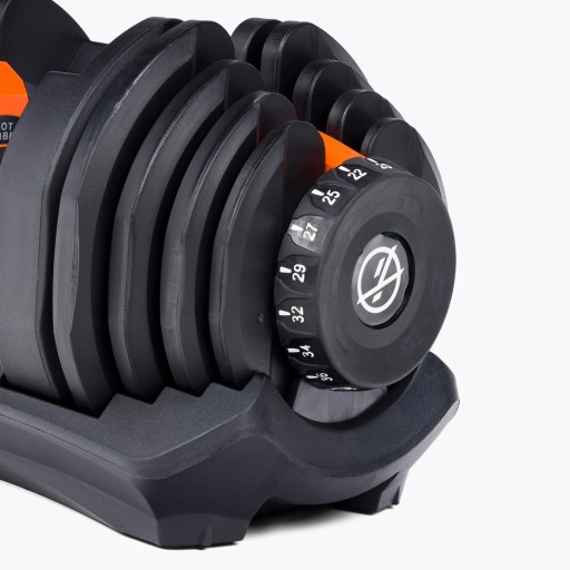 Regulacja odbywa się za pomocą pokrętła. Wystarczy odłożyć hantel na podstawkę, przekręcić pokrętło po obu stronach na potrzebne obciążenie i unieść sprzęt. W ten sposób unikasz konieczności każdorazowego zdejmowania zacisków z gryfu i przekładania talerzy w celu dobrania niezbędnego ciężaru.