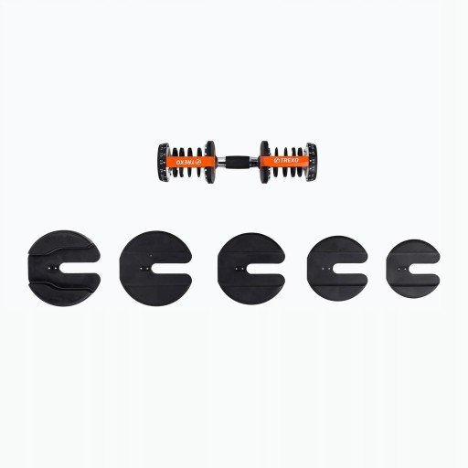 Hantel regulowany TREXO to zestaw składający się z 10 talerzy, gryfu ważącego 2,2 kg i podstawki. System łatwej regulacji za pomocą pokrętła umożliwia szybką zmianę obciążenia, a przez to wykonanie treningu ogólnorozwojowego czy skupiającego się na konkretnej partii mięśniowej.