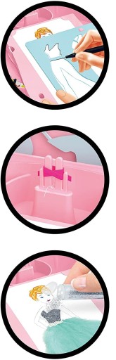 - W zestawie: różowe studio, 4 arkusze z szablonami, 6 dwustronnych flamastrów, 6 wodoodpornych kredek, 1 pędzelek, 1 czarny cienkopis, 1 pojemnik złotych kuleczek, 1 pojemnik czarnego brokatu, 1 pojemnik różowego brokatu, 1 torebka diamencików, 1 para nożyczek, 1 torebka mini guziczków, 1 tubka kleju, 1 torebka piórek, 5 arkuszy samoprzylepnego filcu, 3 arkusze samoprzylepnego papieru brokatowego, 2 arkusze gładkiej samoprzylepnej tkaniny, 2 arkusze samoprzylepnego futerka, 3 arkusze materiału typu skaj, 5 rodzajów tasiemek, 1 szpulka białych nici, temperówka, patyczek pomocniczy,30 nadrukowanych modeli, instrukcja obrazkowa