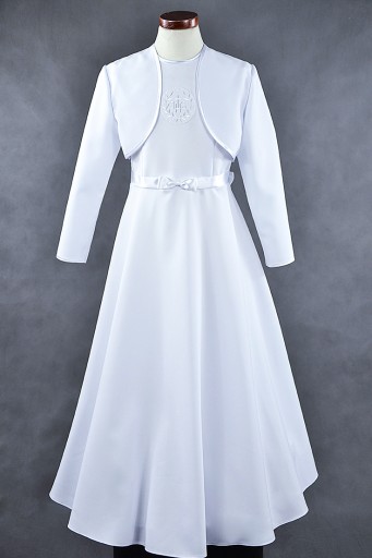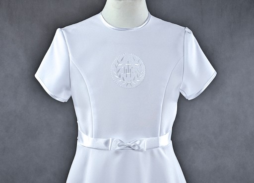 Sukienka uszyta jest ze śnieżnobiałej tkaniny komunijnej gabardyna-strecz , zdobiona kokardką z satynowej tasiemki.