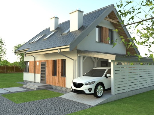✅ Wiata garażowa przy jednej ze ścian szczytowych z dodatkowym wyjściem z kotłowni zapewnia funkcjonalność w zakresie obsługi pomieszczenia z piecem oraz dostęp do pojazdów bezpośrednio z wnętrza budynku.