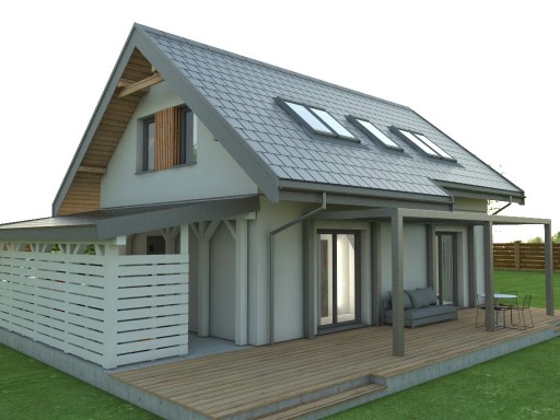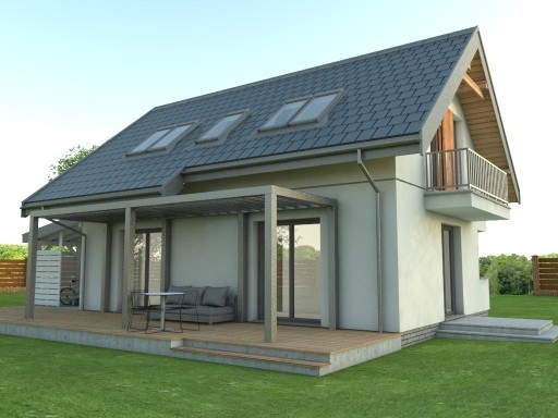 Budynek mieszkalny jednorodzinny z poddaszem użytkowym o powierzchni zabudowy 70 m2 (10 m x 7 m). Na poddaszu budynku pokoje z wyjściem na balkon. Zadaszenie w formie wiaty na bocznej elewacji budynku. Taras z kostki / płyt betonowych na gruncie z pergolą systemową stalową. Dowolność wyboru ogrzewania (paliwo stałe, gaz, pompa ciepła). W salonie zlokalizowany kominek. Dodatkowe wyjście z budynku poprzez kotłownie zlokalizowane na elewacji bocznej. Wentylacja grawitacyjna - kominy prefabrykowane. W pokoju pod schodami dodatkowe miejsce na zabudowę meblową.