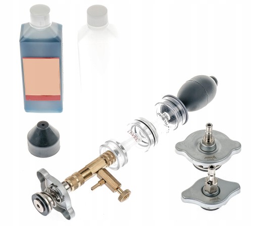 - Przyrząd do pomiaru szczelności uszczelki pod głowicą. (posiada dwie komory odseparowane filtrem oraz uniwersalne przyłącze do korka chłodnicy)