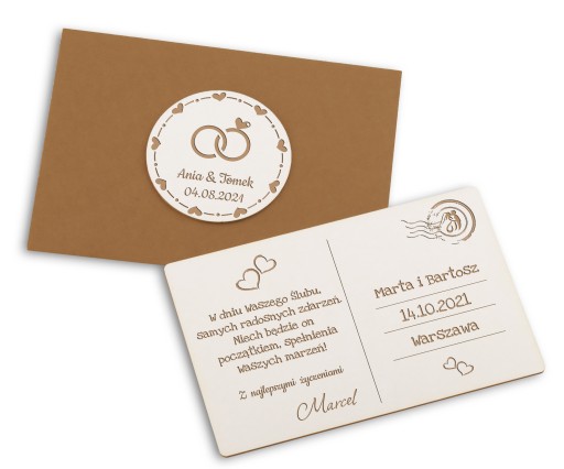 - personalizacja - serduszko na froncie skrzynki z imionami nowożeńców, datą uroczystości oraz dwiema obrączkami.