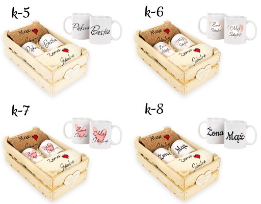 drewniana skrzynka z ręcznikami i kubkami + grawerowana zawieszka na skrzynce + kartka z życzeniami