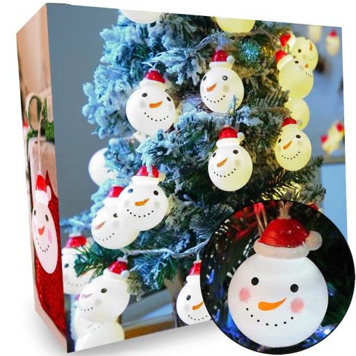 Lampki mają kształt głowy bałwanka w czerwonej mikołajowej czapce, czyli najbardziej charakterystycznego elementu Świąt Bożego Narodzenia. Druciki, utrzymujące girlandę, wykonane zostały z miedzi i otulone transparentnym kablem, co dodaje zestawowi dodatkowego uroku.