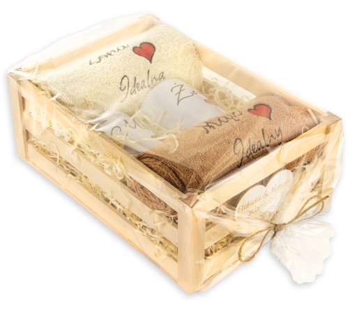 drewniana skrzynka z ręcznikami i kubkami + grawerowana zawieszka na skrzynce + kartka z życzeniami