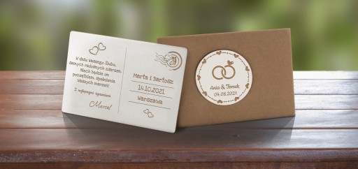 - kartka o wymiarach 10x15 - z lewej strony kartki umieszczamy życzenia oraz imię osoby wręczającej prezent. Z prawej Imiona nowożeńców oraz datę ślubu/wesela.