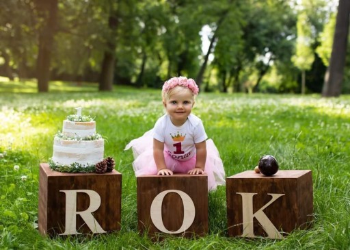 Trzy kostki tworzące napis "ROK". Kostki mają wielkość 30x30x30cm.