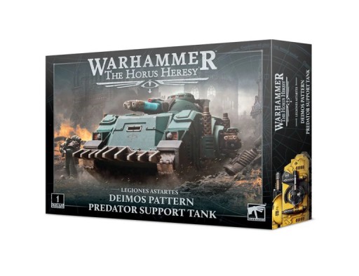 This multipart plastic kit builds one Legion Support Predator, a versatile battle tank in the Deimos pattern. This powerful tank stalks the battlefield in armoured squadrons, and can be built with one of five turret weapons – a long-range heavy conversion beam cannon, a devastating executioner plasma destroyer, an armour-piercing magna-melta cannon, an infantry-melting flamestorm cannon, or a vehicle-slaying neutron blaster. It also boasts a pair of sponson weapons – heavy bolters, heavy flamers, lascannons, or volkite culverins – that can supplement its primary weapon or allow it to engage a more diverse range of threats.