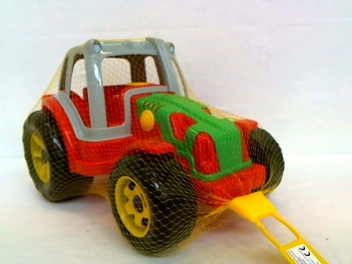 Masywny traktor z kierownicą oraz światłami umieszczonymi na kabinie.