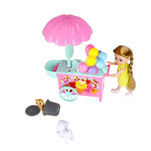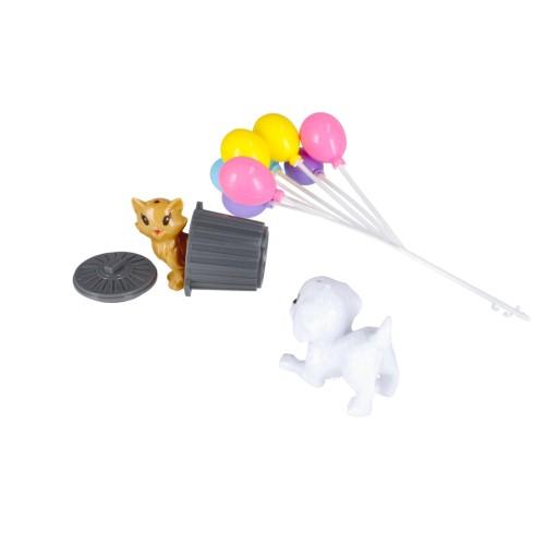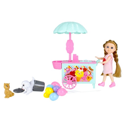 ⭐Zawartość zestawu: lalka w ubranku, lodziarnia, baloniki na druciku, pies, kot, kosz na śmieci.