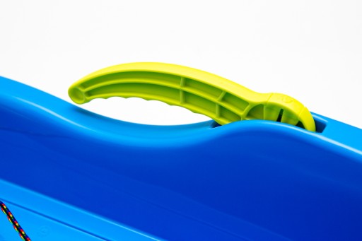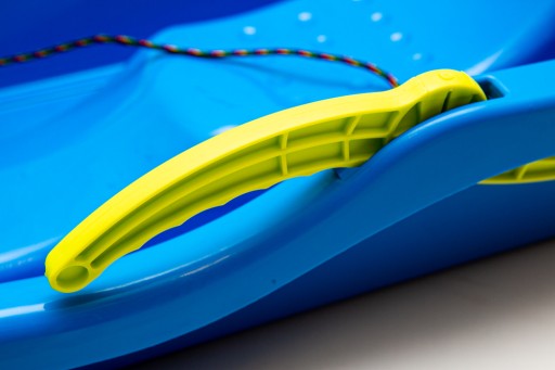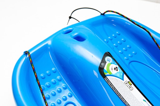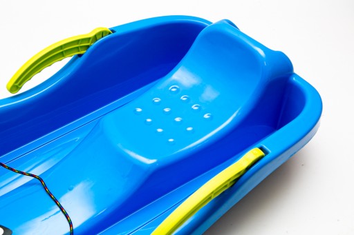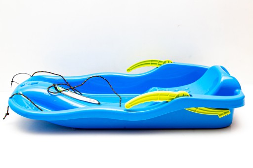 Głębokie sanki plastikowe z dźwigniami do hamowania i sterowania oraz linką do ciągnięcia. Kupujesz zestaw 2 sztuk