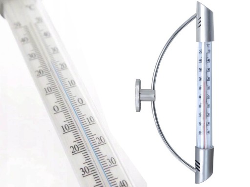 - WYTRZYMAŁY - Wykonany z chromowanej stali nierdzewnej w srebrnym kolorze oraz akrylu. Termometr jest wytrzymały i odporny na warunki pogodowe, takie jak deszcz, słońce czy mróz.