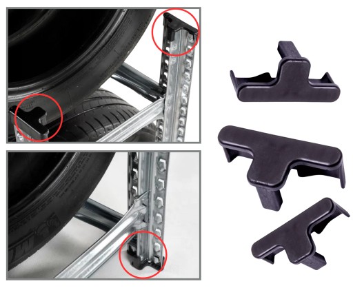W zestawie specjalne spinki zabezpieczające belki - poziom składowania przed przypadkowym wybiciem. Łatwy i bezpieczny montaż i demontaż.